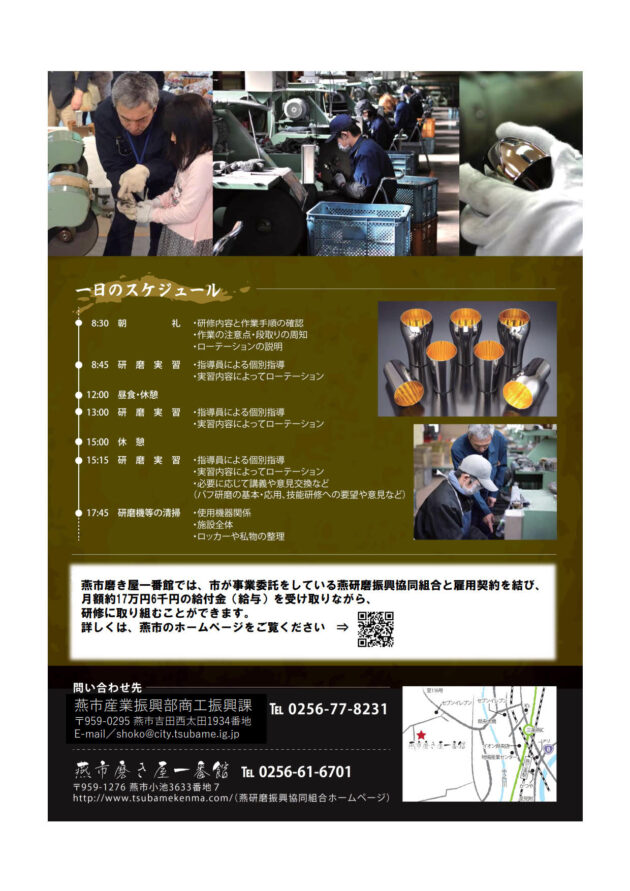 燕市磨き屋一番館では、金属研磨技術を学ぶ研修生を募集しています。